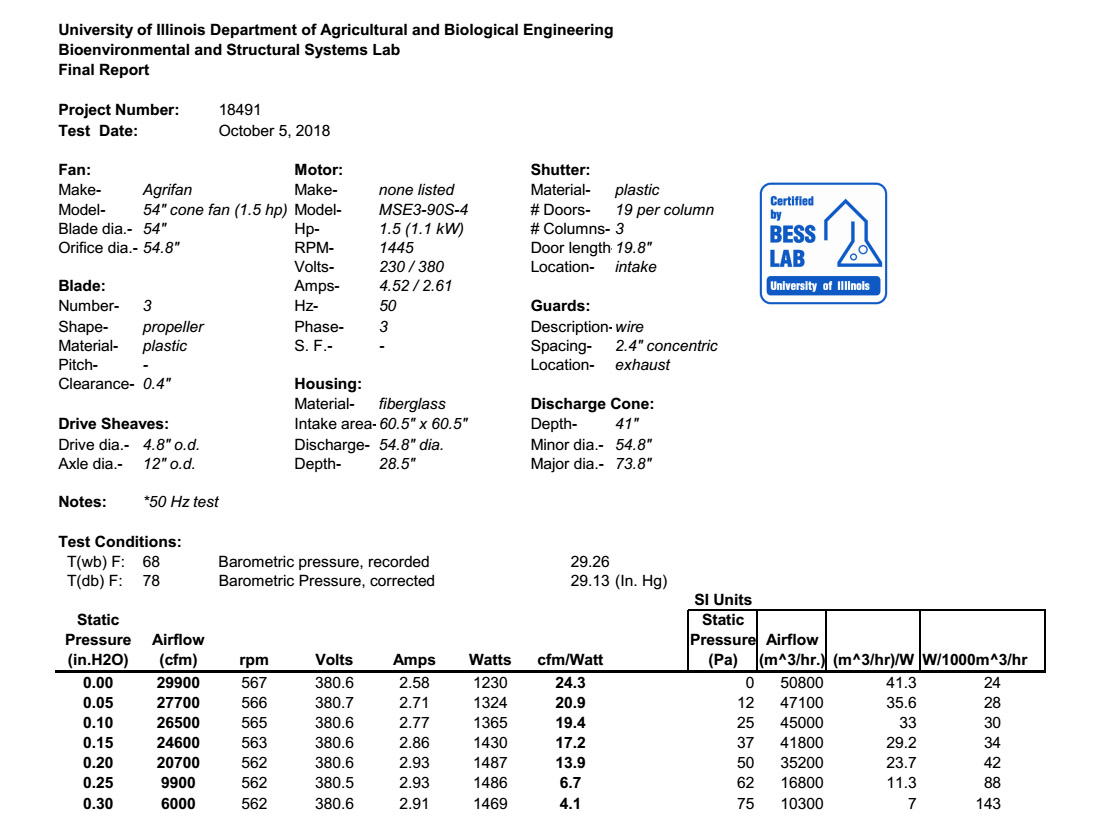 靜壓0.1英寸水柱下的風(fēng)量是極其重要的,因?yàn)樗切笄萆岘h(huán)境下風(fēng)機(jī)的運(yùn)行環(huán)境壓力。風(fēng)機(jī)的性能數(shù)據(jù)通常是靜壓0水柱,但在實(shí)際運(yùn)用過(guò)程中很少用到。作為通風(fēng)設(shè)計(jì)標(biāo)準(zhǔn),養(yǎng)豬手冊(cè)和養(yǎng)牛手冊(cè)提供了在寒冷、溫和和炎熱氣侯下的通風(fēng)比率。選持合適的風(fēng)機(jī)才能滿足這些需求。